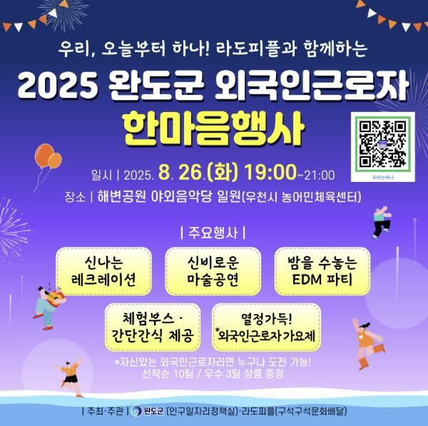 [한국제일신문, 김성옥기자] 완도군은 8월 26일 오후 7시, 완도 해변공원 야외 음악당에서 외국인 근로자와 주민이 함께 어우러지는 『2025 외국인 근로자 한마음 행사』를 개최한다.