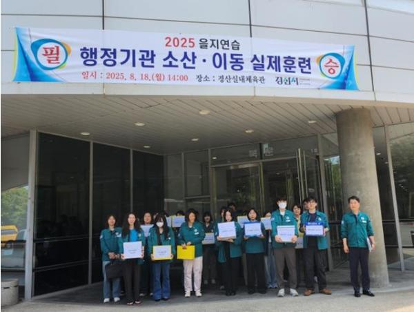 [한국제일신문, 김성옥기자] 경산시는 18일 본청 및 의회사무국 등 33개 부서가 참여한 가운데 2025년 을지연습 행정기관 소산이동 훈련을 실시했다.