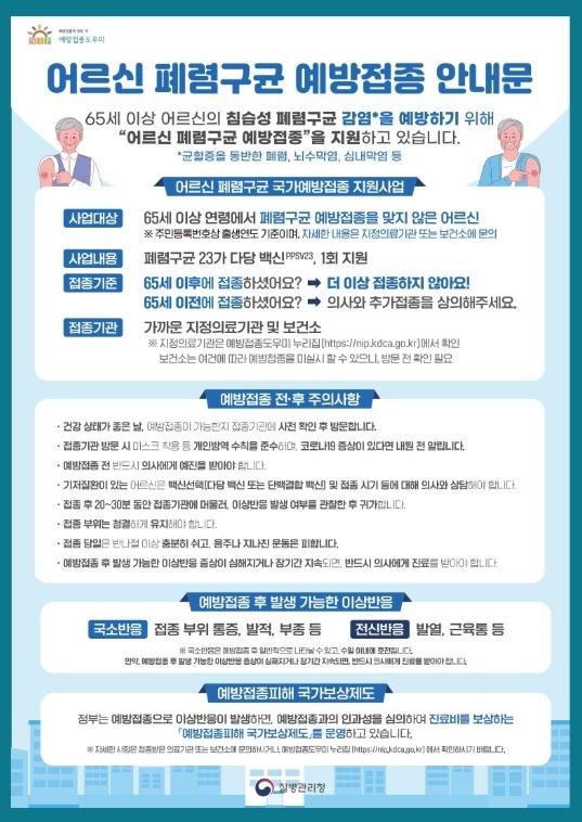 서철모 청장은 “폐렴은 고령층에게 치명적일 수 있는 질환으로, 예방이 가장 좋은 방법”이라며 “65세 이상 어르신들께서는 보건소나 지정 의료기관에서 무료 예방접종을 꼭 받으시길 바란다”고 당부했다.