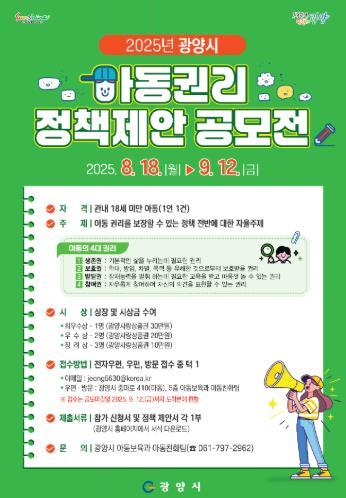 [한국제일신문, 김성옥기자] 광양시는 8월 18일부터 9월 12일까지 '2025년 아동권리 정책제안 공모전'을 개최한다고 밝혔다.