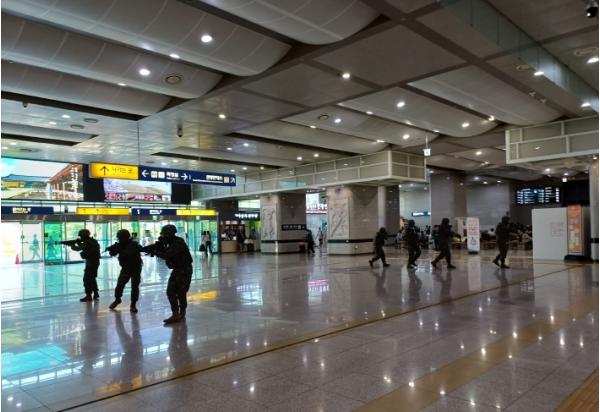훈련은 적 테러범 2명이 경주역에 침투해 폭발물을 터뜨리고 화학물질을 살포해 건물이 파괴되고 다수의 사상자가 발생한 상황을 가정해 단계별로 전개됐다.