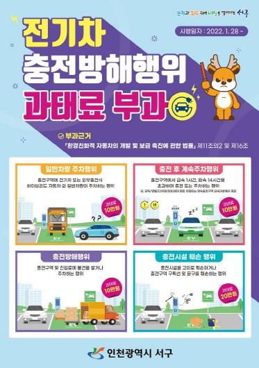 [한국제일신문, 김성옥기자] 인천 서구는 친환경자동차 충전시설을 효율적으로 운영하기 위해, 오는 9월 8일부터 모든 충전방해행위에 계도 없이 즉시 과태료를 부과하는 행정예고를 시행한다고 20일 밝혔다.