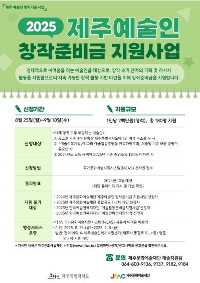 신청 자격은 '예술인복지법'상 예술활동증명을 완료하고, 2024년 소득인정액이 올해 기준 중위소득 120% 이하이며, 공고일 기준 주민등록상 제주특별자치도에 1년 이상 주소를 둔 예술인이다.