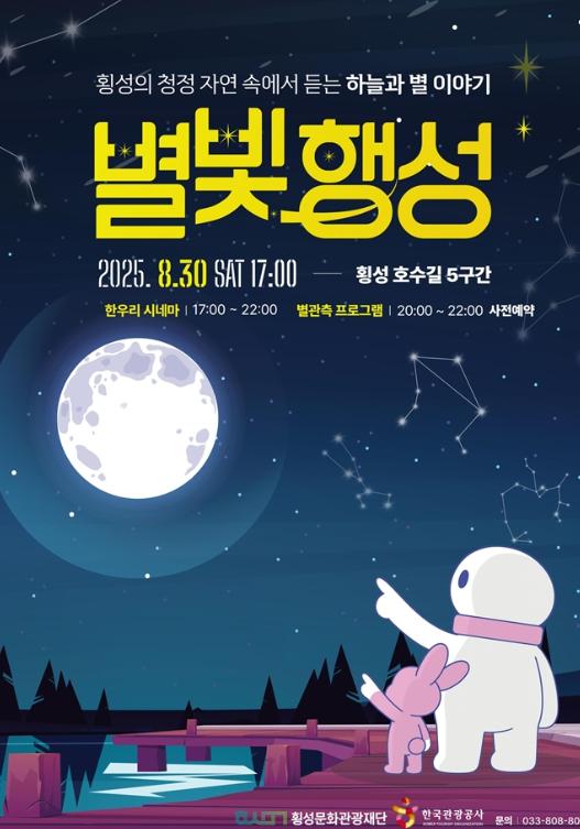 [한국제일신문, 김성광기자] 횡성문화관광재단은 지난 8월 2일 안흥찐빵모락모락마을에서 야간관광 활성화프로그램을 개최한데 이어, 오는 30일 오후 7시부터 횡성 호수길 일원에서‘별빛행성’,‘한우리시네마’ 프로그램을 개최한다고 전했다.