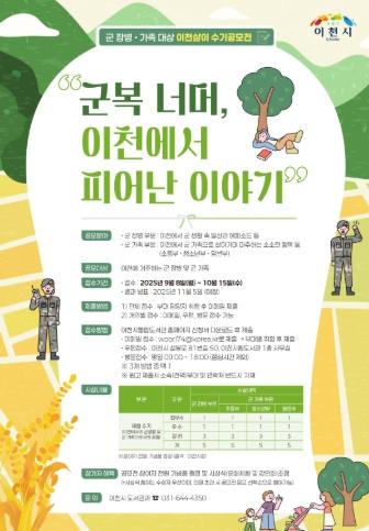 김경희 이천시장은 "이번 공모전은 군복을 입은 시민으로서의 이야기를 지역사회와 함께 나누는 뜻깊은 자리가 될 것”이라며 “많은 군 장병과 가족들이 진솔한 삶의 이야기를 들려주길 기대한다”라고 전했다.
