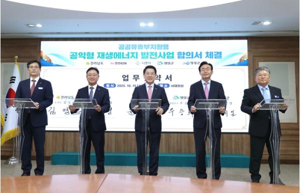 [한국제일신문, 김성옥기자] 영암군이 15일 전남도청에서 전라남도, 나주시, 영광군, 한전KDN(주)과 ‘공공 유휴부지 활용 공익형 재생에너지 발전사업 업무협약’을 체결했다.