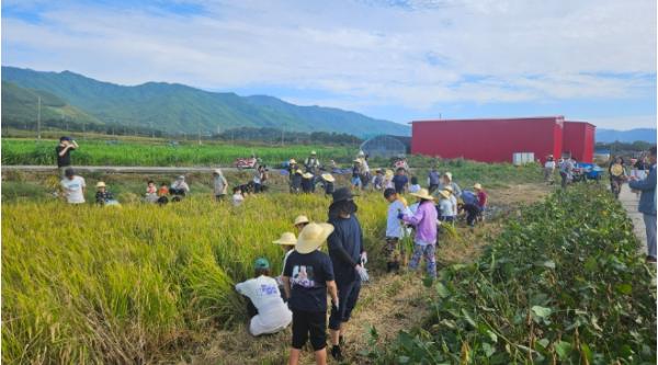 벼 수확 체험은 지난 5월 광의초 학생들이 직접 모내기를 했었던 농지에서 진행됐고, 재학중인 지역학생 13명, 농산유학생 22명 및 학부모 등 60여명이 참여했다.