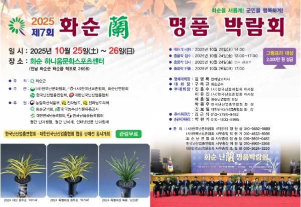 [한국제일신문, 김성옥기자] 대한민국 난(蘭) 산업의 중심지로 자리매김하고 있는 전남 화순군이 ‘제7회 2025 화순 난 명품 박람회’를 오는 10월 25일부터 26일까지 이틀간 화순 하니움문화스포츠센터 실내체육관에서 개최한다.