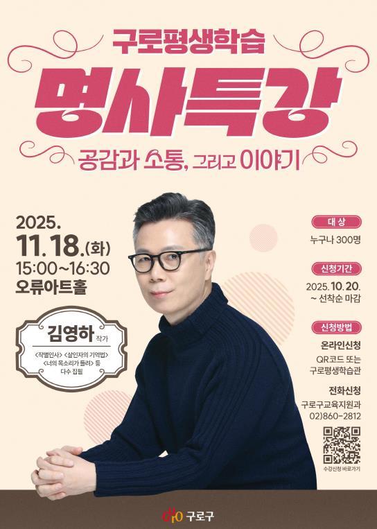 장인홍 구로구청장은 “김영하 작가의 이야기를 통해 구민들이 공감과 위로를 얻는 시간이 되길 바란다”며 “누구나 쉽게 배우고 공감할 수 있는 배움의 장을 지속적으로 넓혀가겠다”고 밝혔다.