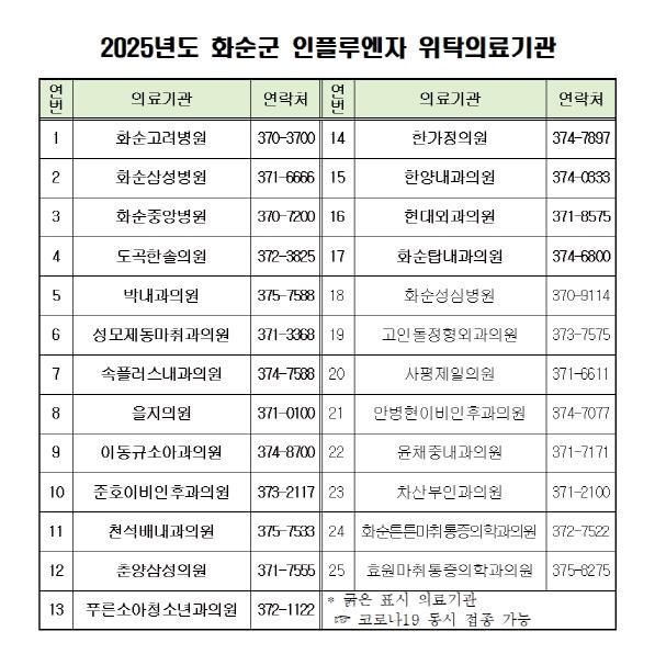 [한국제일신문, 김성옥기자] 화순군은 65세 이상 어르신을 대상으로 2025~2026 절기 인플루엔자(독감) · 코로나19 무료 예방접종을 실시한다고 21일 밝혔다.
