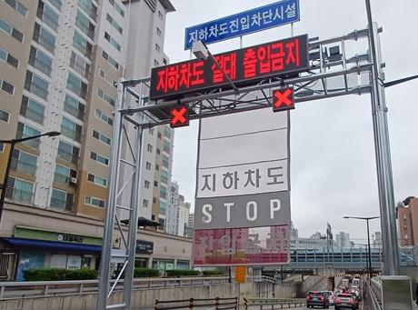 ‘진입차단시설’은 지하차도 내 설치된 폐쇄회로(CC)TV와 감지센서를 통해 침수위험이 감지되면 진입차단막을 내리고 전광판, 경보기 등을 울려 운전자들에게 위험을 신속하게 공지, 진입 자체를 통제하는 도로시설물이다.