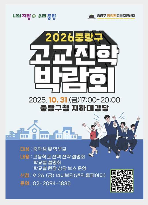 [한국제일신문, 김성옥기자] 중랑구는 오는 10월 31일 오후 5시부터 8시까지 중랑구청 지하 대강당에서 ‘2026학년도 중랑구 고등학교 진학박람회’를 개최한다. 이번 행사는 지역 내 중학생과 학부모 500여 명을 대상으로 진행되며, 학생들의 진로 탐색과 진학 준비를 지원하기 위해 마련됐다.