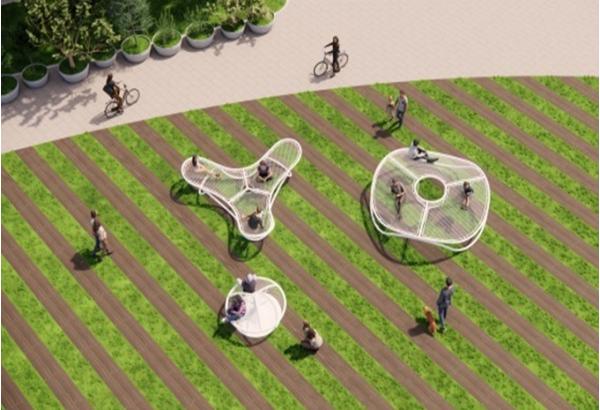 휴게공간 '한들한들'은 그물망에 누워 자연과 함께 가볍게 흔들리며 휴식하는 이미지를 형상화한 디자인 휴게시설물로, 3가지 타입의 각기 다른 모델을 구현하여 이용 시민들에게 3人 3色 즐거운 휴식 경험을 제공할 계획이다.