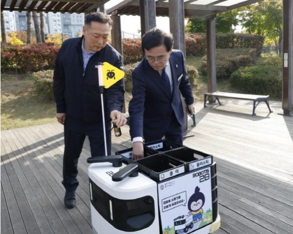 공원에는 자율주행 로봇 2대가 운영되고 있다. 오전 10시부터 오후 7시까지는 재활용품 수거를 돕고 오후 6시 30분부터 9시 30분까지는 야간 순찰활동을 한다.