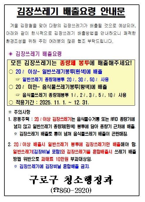 구로구 관계자는 “한시적으로 김장 쓰레기를 일반(흰색) 종량제봉투에 버림으로써 주민들의 불편을 최소화할 수 있을 것”이라며, “김장 쓰레기와 일반 쓰레기를 혼합해 버리지 않도록 적극적인 협조를 부탁드린다”고 말했다.