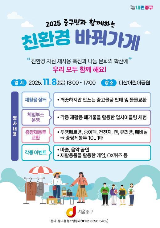 [한국제일신문, 김성옥기자] 서울 중구는 오는 11월 8일 오후 1시부터 5시까지, 다산어린이공원에서 ‘2025년 중구민과 함께하는 친환경 바꿔가게’ 행사를 개최한다.