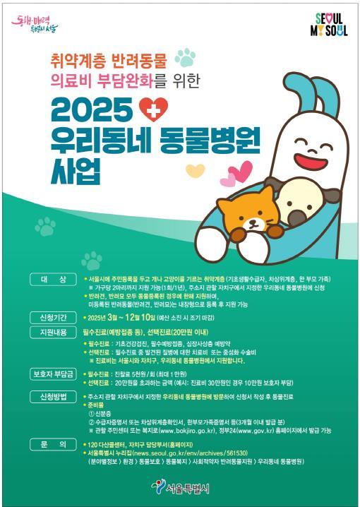 박희영 용산구청장은 “취약계층 주민들이 가까운 지정 병원에서 부담 없이 반려동물의 진료와 치료를 받을 수 있도록 적극 안내하겠다”고 밝혔다.