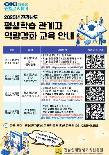 범희승 전남인재평생교육진흥원장은 “AI·디지털 기반 역량을 강화해 지역 특성에 맞는 학습 프로그램을 운영하도록 지원하겠다”며 “앞으로도 평생학습 현장의 전문성 강화를 통해 교육 품질을 높이는데 힘쓰겠다”고 말했다.