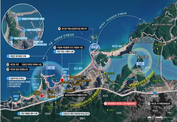 고성 대진항은 “경제도약형(1유형)”으로, 인근 화진포 리조트 개발과 연계해 수산물 가공·유통시설과 관광 인프라를 구축, 민자사업과 어촌이 상생하는 강원 북부권의 해양산업·관광 복합경제 거점으로 육성할 예정이다.