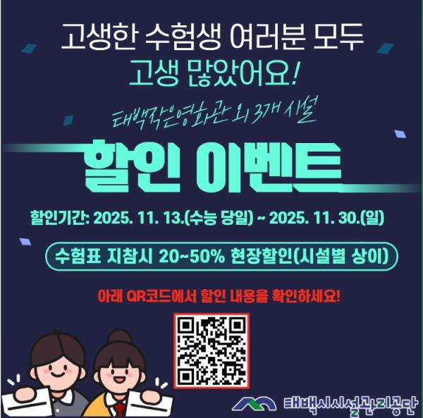 태백시시설관리공단 관계자는 “수능이라는 큰 여정을 마친 수험생들이 지역 공공시설에서 편안한 휴식과 여가를 즐기며 새로운 출발을 준비하길 바란다”며 “앞으로도 시민의 일상에 힘이 되는 다양한 참여형 이벤트를 지속적으로 추진하겠다”고 말했다.
