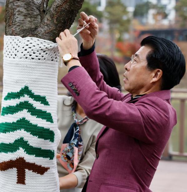 지난 8월부터 약 석 달간 60여 명의 주민 봉사단이 매주 두 시간씩 모여 뜨개 작품을 완성했다. 이들이 만든 다채로운 뜨개옷은 위례호수공원 산책로를 따라 나무 132그루에 설치돼 겨울을 앞둔 공원에 따뜻한 색감과 이야기를 더한다.