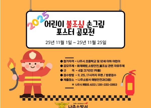 작품 제출은 11월 25일까지 나주소방서 예방안전과에 직접 방문하거나 우편으로 접수하면 된다.