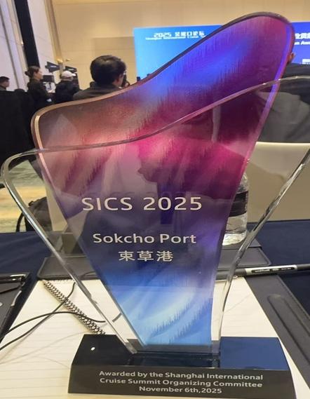 [한국제일신문, 김성옥기자] 강원특별자치도와 속초시, 강원관광재단은 11월 6일 중국 상하이에서 열린 '2025 상하이 국제 크루즈 서밋(Shanghai International Cruise Summit)'에서 속초항이 ‘아시아 우수항만상(Emerging Cruise Port Development Award)’을 수상했다고 밝혔다.