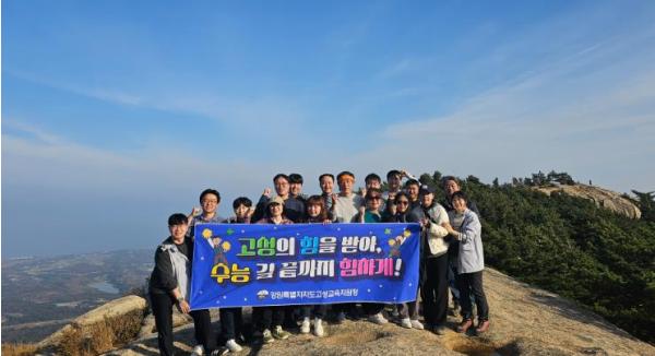참가자들은 ‘고성의 힘을 받아, 수능 길 끝까지 힘차게!’라는 문구가 담긴 현수막 앞에서 수험생들의 노력이 결실을 맺기를 기도하며 응원의 메세지를 전했다.