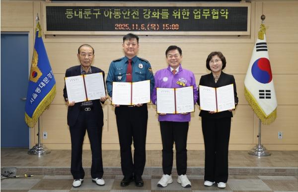 이날 협약식에는 이필형 동대문구청장을 비롯해 박시홍 동대문경찰서장, 이미경 서울동부교육지원청 교육장, 송경엽 재향경우회장이 참석해 아동 안전 강화를 위한 공동 대응 의지를 다졌다.