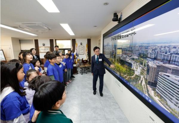 아이들은 구청장과 함께 화면 속 자료를 보며 “우리 동네에서 이런 일을 하고 있었어요?”라며 놀라워했고, 실제 행정이 지역 변화와 어떻게 연결되는지 직접 체감하는 시간을 가졌다.