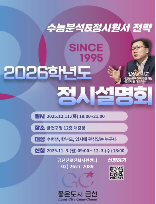 [한국제일신문, 김성옥기자] 금천구는 2026학년도 정시모집을 앞둔 수험생과 학부모를 위해 12월 11일 청사 대강당에서 진행하는 ‘2026학년도 대학입학 정시 설명회’의 참여 신청을 받는다고 밝혔다.