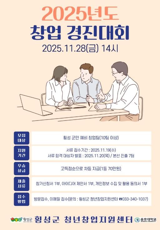 [한국제일신문, 김성광기자] 횡성군 청년창업지원센터는 지역 내 창업 분위기 확산 및 참신한 아이디어를 발굴하기 위한 ‘2025 창업경진대회’ 참가자 모집을 11월 19일까지 진행한다.