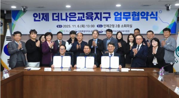 군은 최근 인제군청 소회의실에서 강원특별자치도교육청, 인제교육지원청과 함께 ‘더나은교육지구 재지정(3기) 업무협약’을 체결했다.