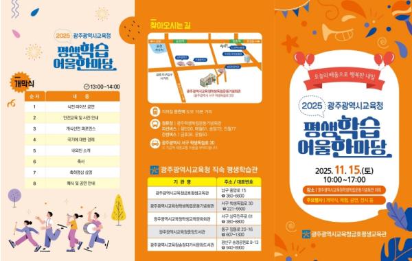 [한국제일신문, 윤진성기자] 광주시교육청금호평생교육관은 오는 15일 광주시교육청학생독립운동기념회관 야외 일원에서 시민 등을 대상으로 ‘2025 광주광역시교육청 평생학습 어울 한마당’을 개최한다.