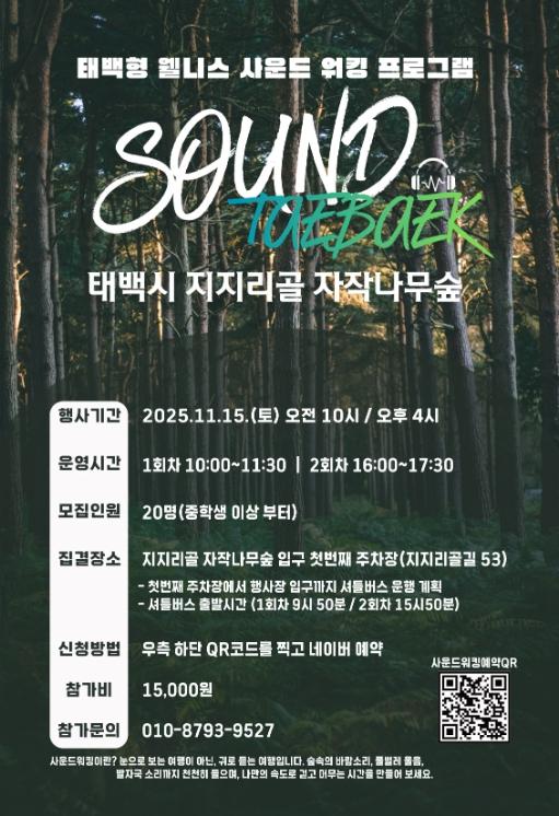 참여자들은 숲과 계곡을 걸으며 새소리·바람소리·물소리·발자국 소리 등 자연의 리듬을 온전히 느끼고, 태백의 역사와 생태, 마을 이야기가 담긴 사운드 콘텐츠를 통해 감각적 치유와 휴식을 경험하게 된다.