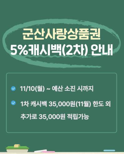 혜택은 11월 10일부터 예산이 소진될 때까지 시행되며, 모바일형 및 카드형 군산사랑상품권을 사용하는 시민이 대상이다.