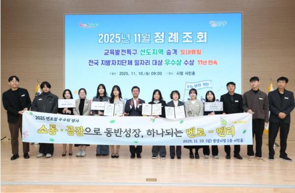 [한국제일신문, 윤진성기자] 광양시는 신규직원의 조직 적응과 공직관 형성을 위해 추진한 2025년 멘토링 활동을 평가하고, 11월 정례조회에서 최우수·우수·장려 6개 팀을 선정해 시상했다고 밝혔다.