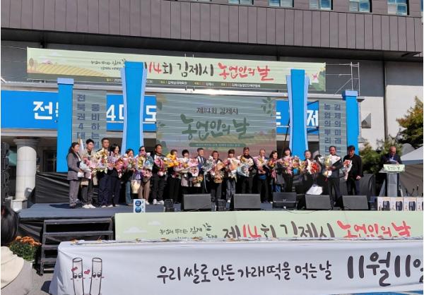 [한국제일신문, 이미란기자] 김제시는 11일, 김제시 실내체육관 앞마당에서 ‘제14회 김제시 농업인의 날’ 행사를 '농업의 뿌리는 깊게, 김제의 미래는 높게'라는 주제로 내외빈과 농업인 2,000여 명이 참석한 가운데 성황리에 개최했다고 밝혔다.