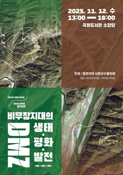 [한국제일신문, 김성옥기자] 접경지역시장·군수협의회는 오는 11월 12일 국회도서관(소강당)에서 “비무장지대의 생태·평화·발전”을 주제로 '2025 DMZ 발전포럼'을 개최한다. 이번 포럼은 올해 처음으로 열리는 행사로, 휴전 이후 70여 년간 소외되어온 접경지역의 조화로운 발전을 위해 필수적인 비무장지대(DMZ)에 대한 새로운 해석과 해외사례 분석을 통한 생태평화공원 조성 등 다양한 발전 방안을 제시할 예정이다.