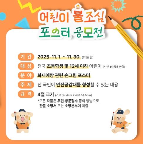 이번 공모전은 지역 내 초등학생이나 12세 이하 어린이를 대상으로 안전의식을 함양하고자 화재예방 메시지를 담은 4절 도화지(가로 39.4cm × 세로 54.5cm) 규격에 직접 그린 포스터 그림으로 1인 1작품만 제출할 수 있고 제출 기한은 이달 21일까지로 해남소방서 예방안전과를 직접 방문해 제출하거나 우편 접수도 가능하다.