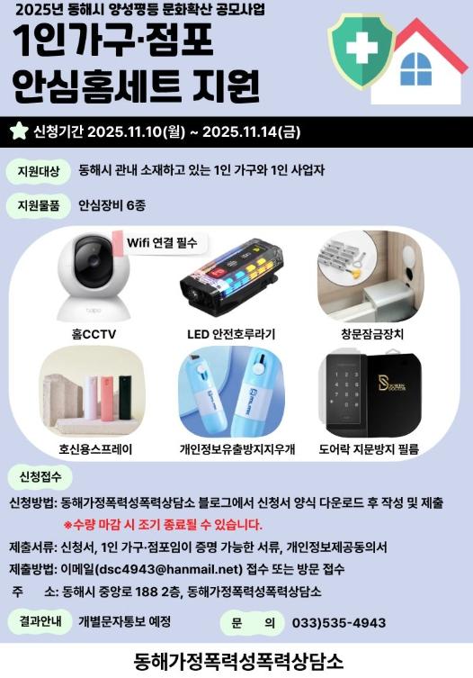 [한국제일신문, 김성옥기자] 동해시는 양성평등 문화확산 공모사업의 일환으로, 1인 가구를 위한 ‘안심홈세트 지원사업’을 추진하고 있다.