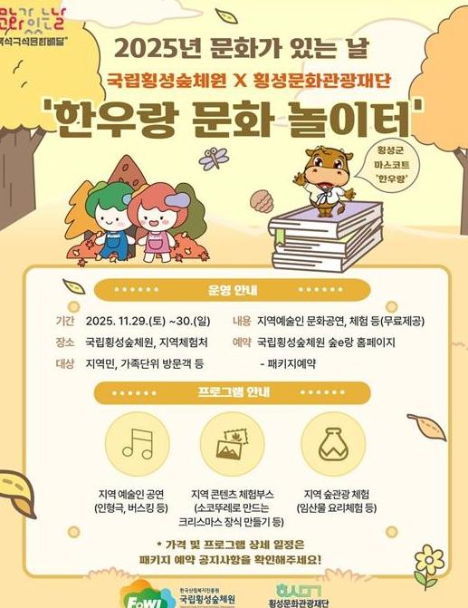 [한국제일신문, 김성광기자] 산림청 한국산림복지진흥원 국립횡성숲체원은 오는 11월 29일부터 30일까지 횡성 지역민 및 문화소외계층을 대상으로 ‘25년 강원특별자치도 문화가 있는 날 구석구석문화배달사업 – 한우랑 문화놀이터’를 개최한다고 밝혔다.