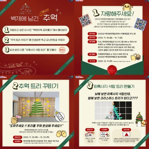 시 관계자는 "이번 프로그램은 따뜻한 연말 분위기 속에서 한 해를 마무리하고, 백제 문화의 감성을 즐길 수 있는 시간이 될 것"이라며 "가족 단위 방문객과 시민들에게 선물 같은 추억을 선사하겠다"고 말했다.