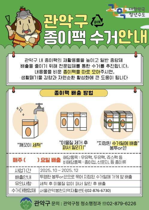 [한국제일신문, 김성옥기자] 관악구가 오는 12월 말까지 ‘종이팩 중점 수거사업’을 집중적으로 추진하여, 종이팩의 재활용률을 높이고 일반 종량제 배출을 줄이는데 주력한다.