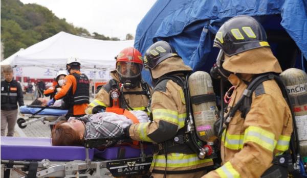 소방청과 전남도소방본부는 이날 규모 7.5의 지진으로 건물과 거북선대교가 붕괴되고, 선박 화재와 산불 등 동시다발적 화재와 폭발이 발생하는 복합 재난 상황을 가정해 실전과 같은 훈련을 펼쳤다.