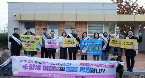13일 나주시에 따르면 수험생들의 노력을 격려하고 안전한 시험 환경 조성을 위해 이날 오전 나주고등학교와 봉황고등학교 정문에서 응원 행사를 진행했다.