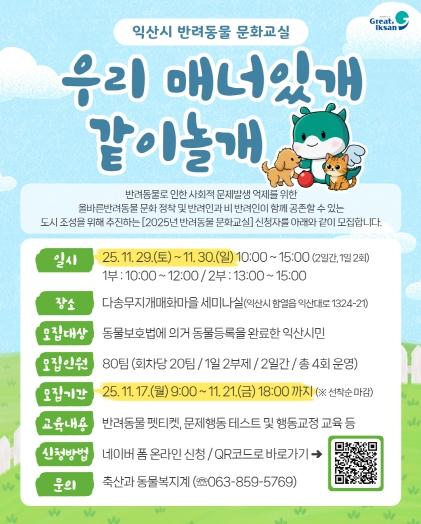 익산시는 오는 29~30일 함열 다송무지개 매화마을에서 '반려동물 문화교실'을 열고, 반려동물 이론 교육과 실습을 진행한다고 13일 밝혔다.