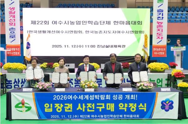 이날 행사에는 한국농촌지도자전라남도연합회와 한국생활개선전라남도연합회가 함께 참여해 총 4개 단체가 2,500만 원 규모의 2026여수세계섬박람회 입장권 구매 약정식을 진행하며 박람회 성공개최 염원에 뜻을 모았다.