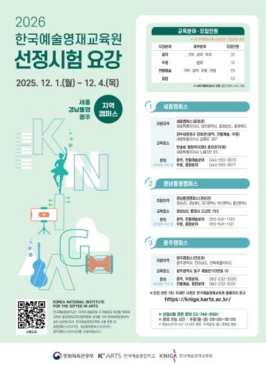 [한국제일신문, 윤진성기자] 광주광역시는 한국예술종합학교 부설기관인 한국예술영재교육원 광주캠퍼스의 2026년도 교육생을 오는 12월 1일부터 4일까지 모집한다고 13일 밝혔다.