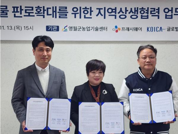 [한국제일신문, 김성옥기자] 영월군농업기술센터는 2025년 11월 13일 목요일 오후 3시, 영월군농업기술센터 2층 회의실에서 CJ프레시웨이, KOICA글로벌인재교육원과 함께 지역상생협력 업무협약을 체결했다.